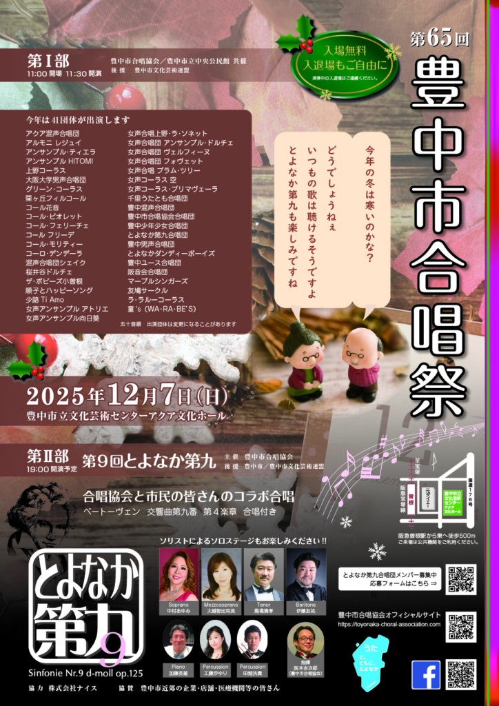 2025年の合唱祭は、アクア文化ホールで41団体が参加されました。今回も第2部の「第9回とよなか第九」までたくさんの皆さまにご来場いただきました。厚く御礼申し上げます。 第2部 第9回とよなか第九は⇒こちら ↑プログラム↑ クリックまたはタップで内容をご覧いただけます。 前のページに戻る