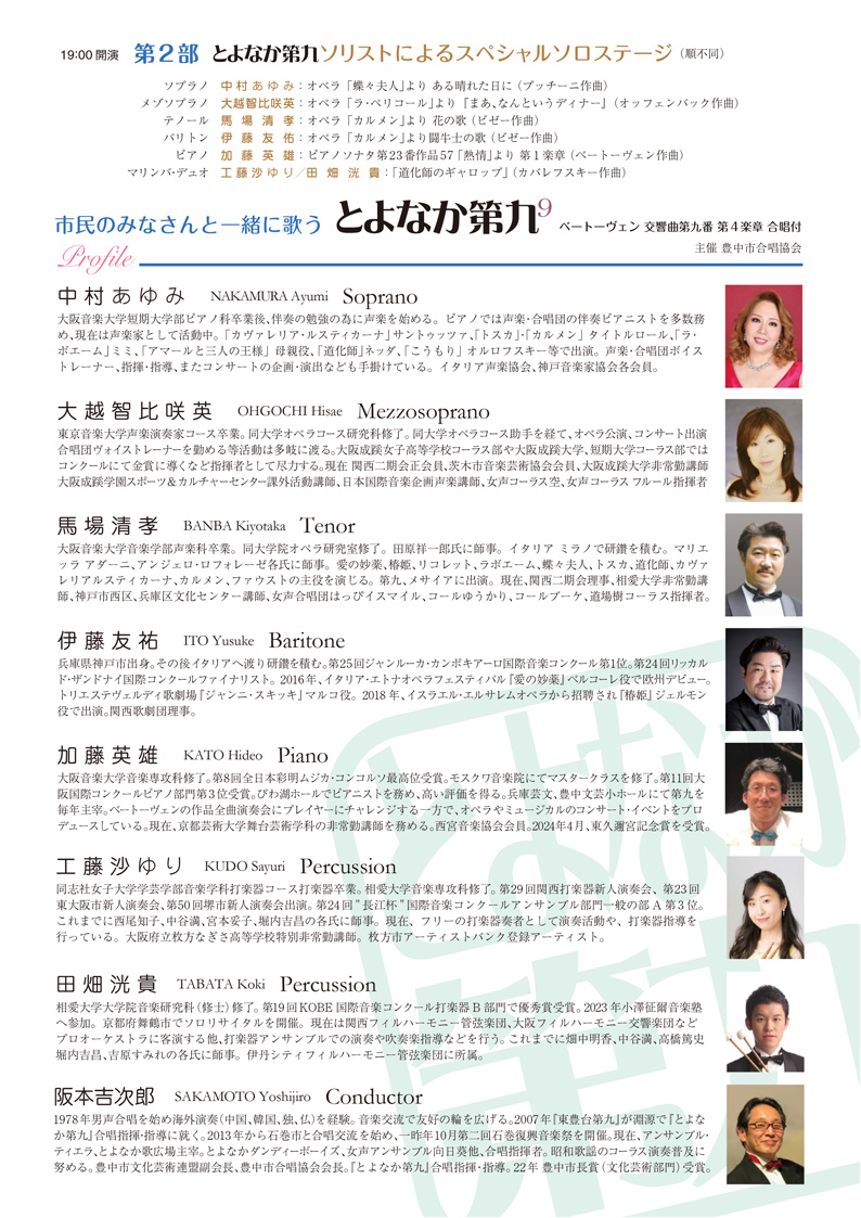 第9回とよなか第九は当協会会長阪本による番外のアマポーラの熱唱にはじまりソリストのソロステージに続いて、合唱協会と応募団員による大合唱で盛大に歌い上げました ↑クリックまたはタップで内容をご覧いただけます。↑ ソプラノ 中村あゆみ メゾソプラノ 大越智比咲英 バリトン 伊藤友祐 テノール 馬場清孝 パーカッション 田畑洸貴&工藤沙ゆり ピアノ 加藤英雄 番外:当協会会長 阪本吉次郎 アマポーラ 前のページに戻る